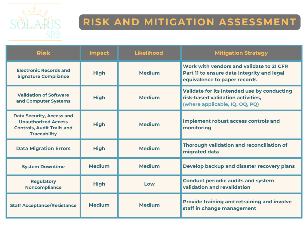 Transitioning introduces new risks including system failures, data breaches, and compliance gaps. Using quality tools such as a risk chart to systematically approach risks will help identify, assess, and mitigate these risks. Please see below for an example of a risk chart: